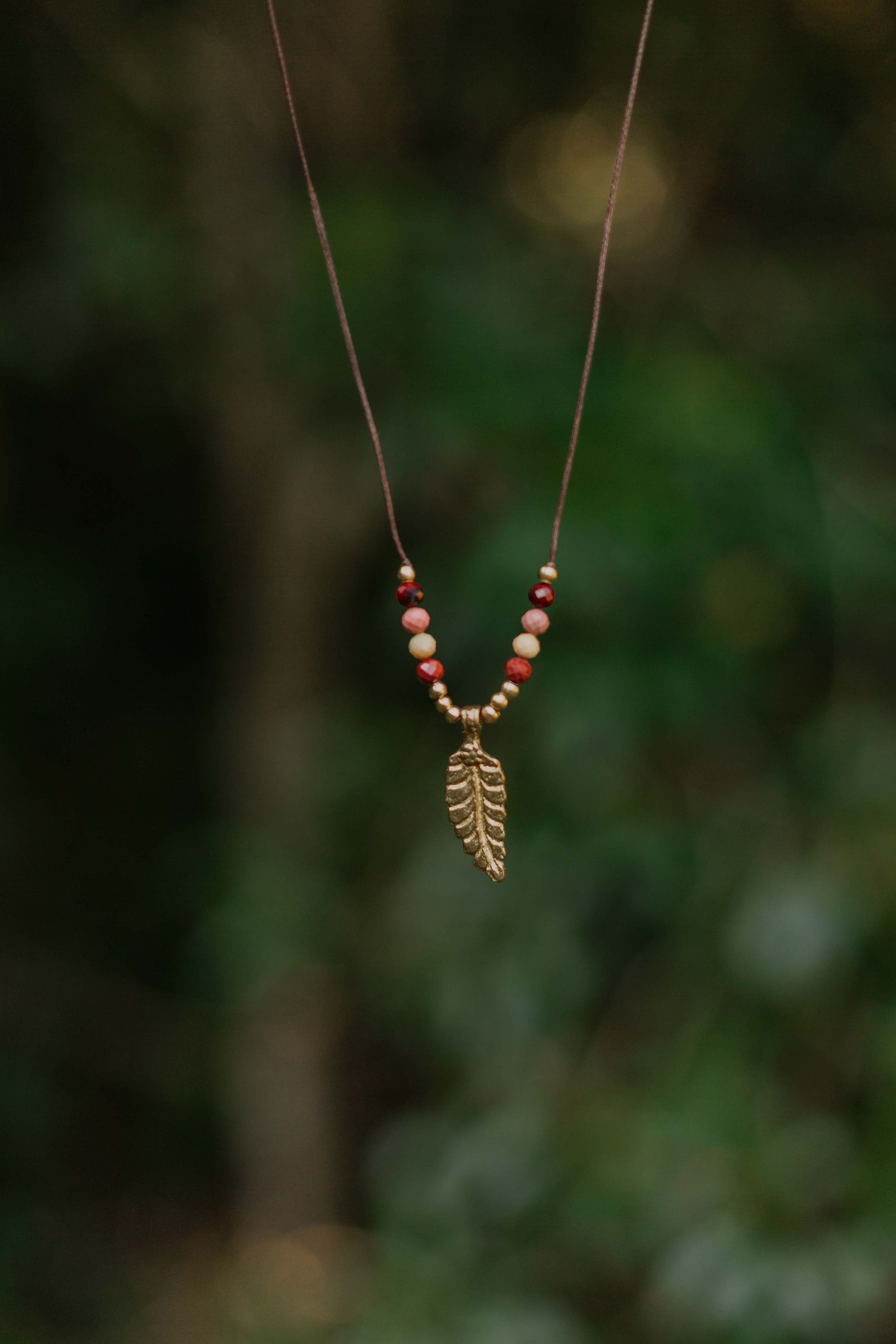 Full adjustable dainty faceted mookaite necklace featuring brass beads and brass leaf