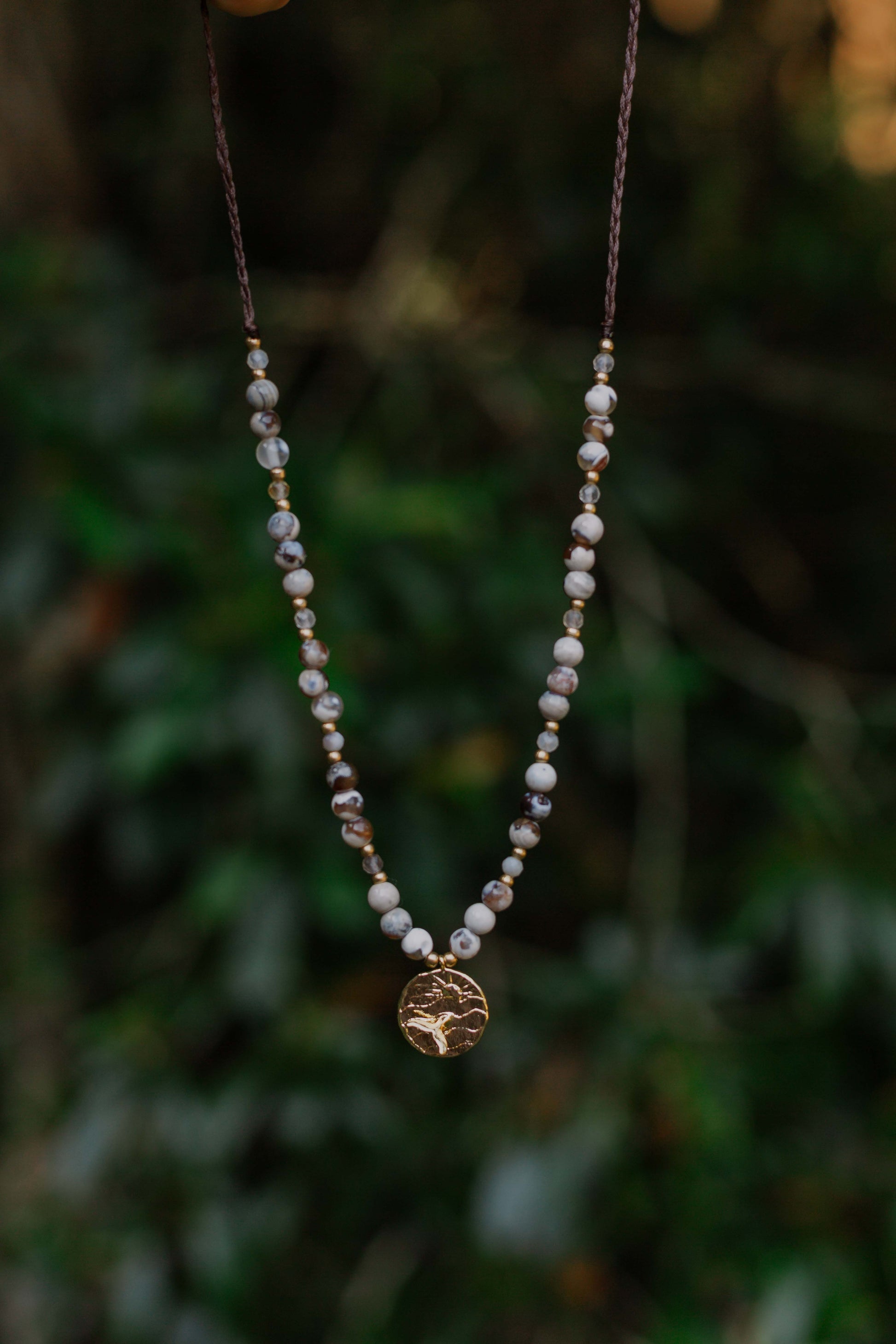 Full adjustable orca agate, faceted agate and brass bead necklace, features a gold-plated raised whale tail and sunrise pendant.
